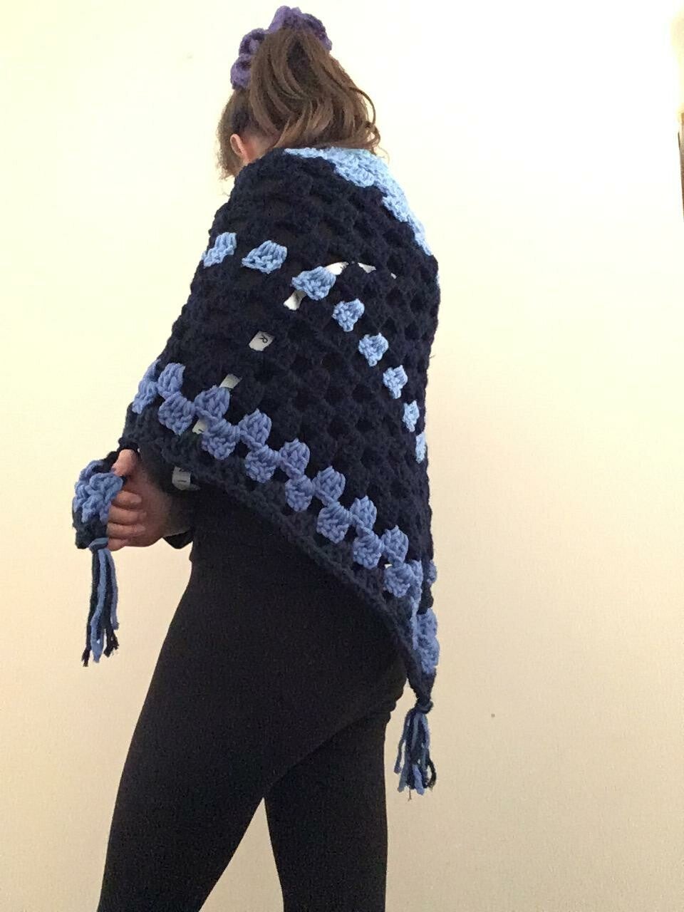 A blue shawl perfect for keeping warm when being outside in the cold. It is capable for more than one use.